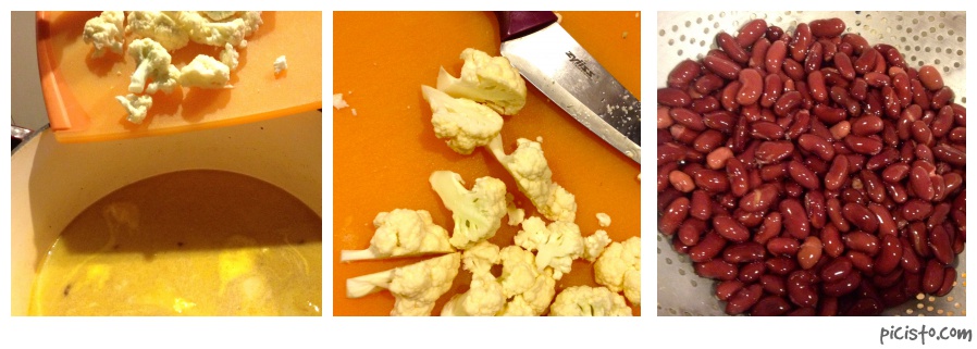Here you mix in the chopped cauliflower with enough water to cover all the vegetables. Add a can of coconut milk (we use a lite, organic variety) and allow enough cooking time for the vegetables to become tender. At this point add the (previously cooked) kidney beans and chick peas (or use a can of each) to the mixture. Allow sufficient time for the beans and peas to warm.