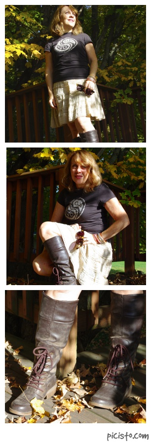 My first look is totally casual, with a comfy tee and skirt, and my old favorite Rocket Dog boots. These flats pull on with ease and allow for a whole day of leaf-peeping or apple-picking in comfort!