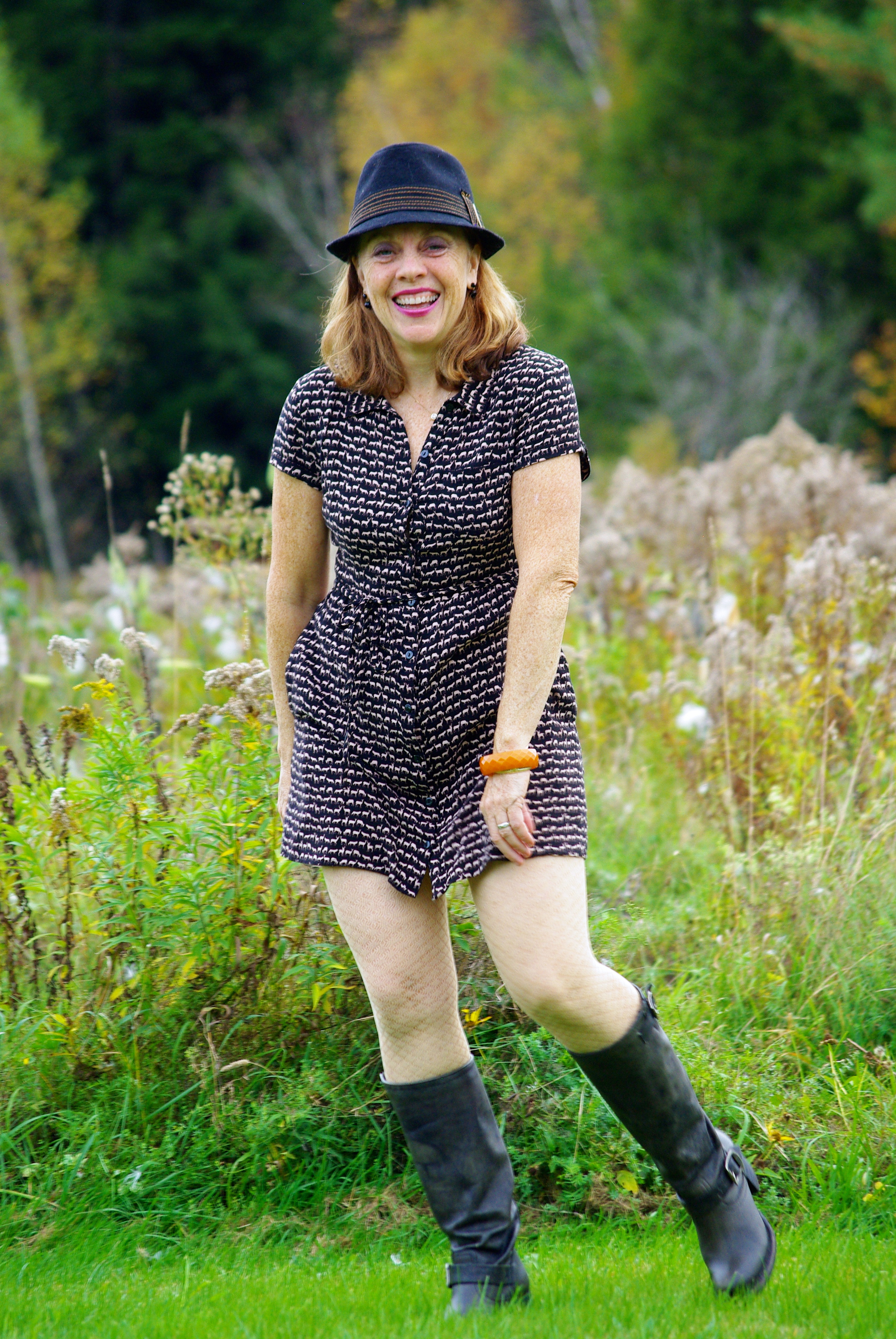 Autumn is upon us, with flooding sunshine and falling leaves and dropping temperatures. This is a favorite time of year because of the blast of color and treats of harvest, after all, who doesn’t love all shades orange or every apple recipe? As I moved summer lightweights to the back of my closet and woolen garments to the front, I made another adjustment, the shift from sandals to boots! Perhaps more than ever boots are everywhere, from the runway to the street, lace-up to zip-up, ankle height to over-the-knee, suede to shiny and in every hue. For this shoot, I dug up a favorite pair from last year and donned new favorites, but each one is a walkable boot–my main criteria. After all, we need to keep moving with all this brilliance around us! Joined by my kitty we danced about in the foliage for a brilliant afternoon.