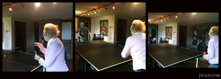 Once assembled it is essential that the first hit be done by a champ. Superstition or tradition, who knows, but we wanted this done right, so we enlisted our favorite pro, the Queen Bee, (a title she was dubbed after her fabulous performance), and her oldest grandson, to be the very first players. And this was not an easy match to call. Tough corner shots and plenty of hard hitting ensued. All in all, the table was properly christened!