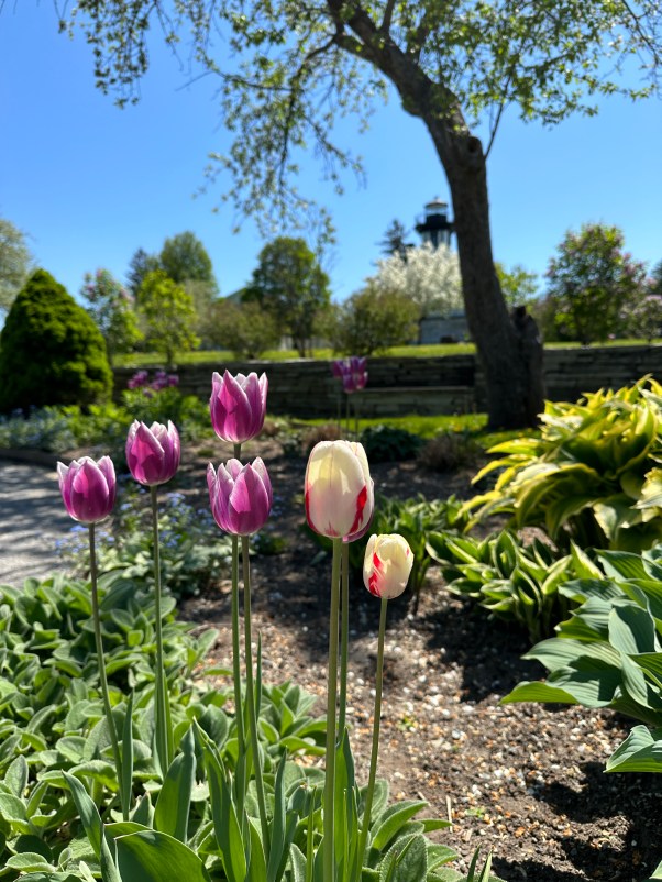 A lighthouse repositioned in a grand park with tulips in the forefront. This Shelburne Museum I love, aflame with purple and red and pink and green and yellow and delight.