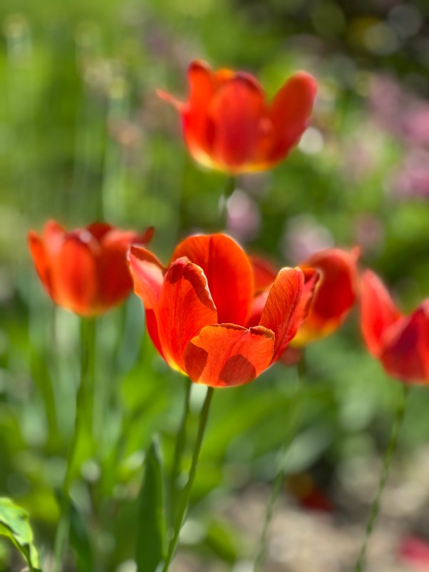 Contrasts abound with the complementary colors of green and red. Thank you tulips.