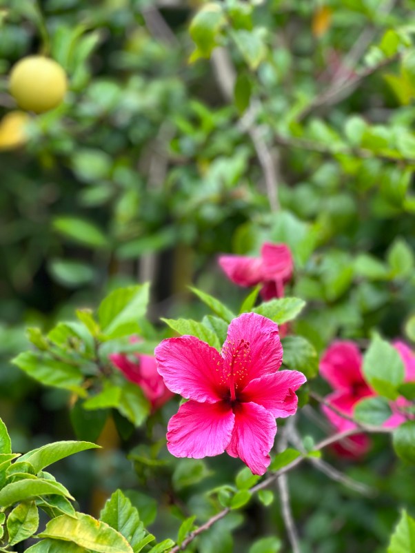 Hibiscus and lemon, growing side by side, two trees that draw hummingbirds and butterflies and even playful sparrows fill this yard with life. All adding to our own.
