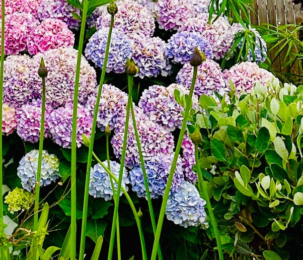Hydrangea is a nostalgic plant from my younger days summering on Long Island. The rich lavender, pink and blue clusters always make me smile.  Oscar Wilde wrote, “A flower blossoms for its own joy,” but this bushy plant overwhelms me with happy and unites both coasts in each and every colorful petal. What a bouquet!